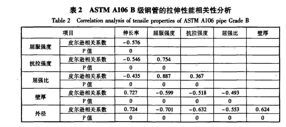 根據(jù)AsTM A106標準要求,B級熱軋無縫鋼 管的機械性能應符合表l要求。歷史數(shù)據(jù)顯示,寶鋼以往生產(chǎn)的此類管件用 管的屈服強度為260一439加)a,均值為338.9 MPa, 標準差為23.77 MPa,其西格瑪水平為4.16;抗拉歷史數(shù)據(jù)顯示,寶鋼以往生產(chǎn)的此類管件用 管的屈服強度為260一439加)a,均值為338.9 MPa, 標準差為23.77 MPa,其西格瑪水平為4.16;抗拉采集了AsTM A106 B級鋼管的拉伸性能歷 史數(shù)據(jù),進行相關性分析¨1(原假設為不相關,備 擇假設為相關,顯著性水平a取0.05),見表2。