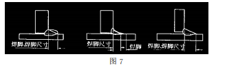 實(shí)際生產(chǎn)中%常把焊腳與焊腳尺寸混為一談%如有 人在工藝文件上要求焊腳尺寸為多少%標(biāo)注角焊縫符 號時(shí)%將 -說成是焊腳尺寸或焊角高度等%這都是錯(cuò) 誤的(究其原因是沒弄清焊腳與焊腳尺寸這兩個(gè)概念 的含義(焊腳是角焊縫的橫截面中從一個(gè)直角面上的 焊趾到另一個(gè)直角面表面的最小距離%而焊腳尺寸為 在角焊縫橫截面中畫出的最大等腰直角三角形中直角 邊的長度(我們通常工藝上要求的*符號中標(biāo)注的檢測 工具檢測的是焊腳而非焊腳尺寸%對于平凸角焊縫%從 理論上來說%焊腳等于焊腳尺寸%而凹面角焊縫則焊腳 尺寸小于焊腳%如圖 .所示(