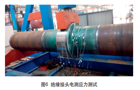 可以在絕緣接頭上選取幾關鍵危險截面,以這些 危險截面來布置應變花完成應變測試,采用應變測試系 統(tǒng)來完成此試驗,獲取應變值,再由所測試到的應變 值,通過數(shù)據(jù)計算及處理,得到最終主應力及主偏角, 絕緣接頭電測應力測試如圖6所示。 2.密封問題 絕緣接頭內(nèi)部有密封環(huán),密封環(huán)在承受外界施加 的預緊力的作用下,將產(chǎn)生彈性變形,達到所需的密封 力,保證管道內(nèi)介質(zhì)不外漏,這也就是絕緣接頭的密封 原理。所以密封件應在介質(zhì)中應有足夠的化學穩(wěn)定性和 耐蝕性,同時具有一定的強度和回彈性。若絕緣接頭發(fā) 生泄漏,會給國家造成巨大的損失,甚至會發(fā)生人員傷亡事故,所以絕緣接頭的密封性能是至關重要的。