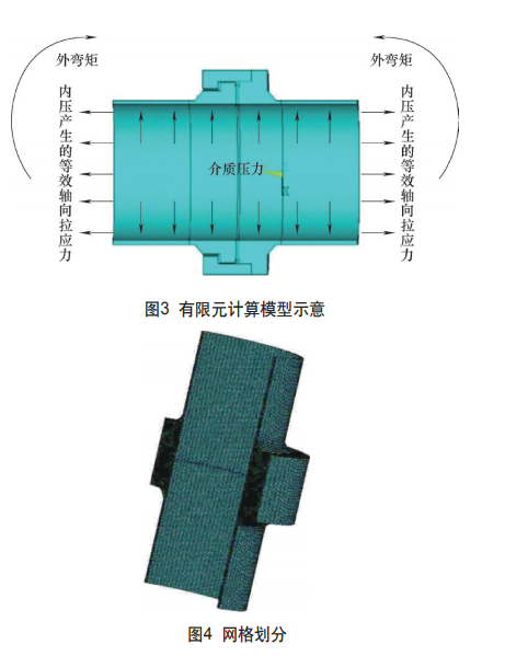 1.、強度、剛度問題 與工業(yè)閥門不同,絕緣接頭大多使用在埋地輸油 輸氣管道,會受到地質(zhì)環(huán)境和管線應力的影響,其所受 到外界荷載是復雜多變的,所以在設計計算時,要慎重考慮絕緣接頭的強度及剛度問題,即既要滿足強度要 求,又要滿足剛度邊界條件。 查閱我國壓力容器通用標準《GB150.3-2011壓力 容器 第3部分:設計》,可以將絕緣接頭設計計算簡化 為整體法蘭模型和卡箍模型。比如,用整體法蘭計算模 型來講,在滿足軸向應力σ H≤1.5[σ] t f ,徑向應力 σ R≤[σ] t f ,切向應力σ T≤[σ] t f ,但同時還需滿足剛 性指數(shù)J≤1,所以在計算中,必須考慮同時考慮強度和 剛性的問題。 (1)解決方案一:建立分析模型 借助于ANSYS 有限元分析軟件,模擬絕緣接頭在承受內(nèi)壓和外界荷載 的復雜受力狀況下,然后建立單元進行分析,有限元計 算模型示意、網(wǎng)格劃分分別如圖3、圖4所示。